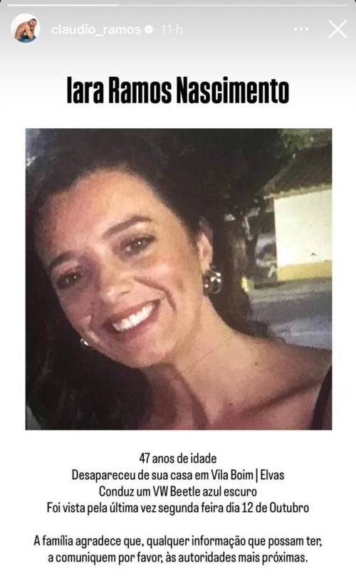 No apelo publicado, Cláudio descreve alguns detalhes que podem ajudar nas buscas. “Desapareceu de casa em Vila Boim, Elvas. Conduz um VW Beetle azul escuro e foi vista pela última vez na segunda-feira, dia 12 de outubro.Agradecemos que qualquer informação seja comunicada de imediato às autoridades competentes”, escreveu o apresentador.